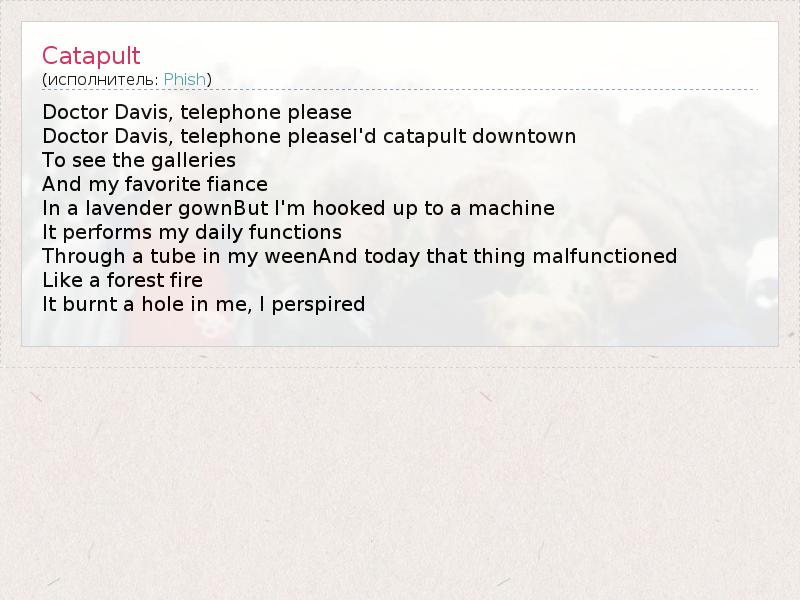 Это интересно:Phish — американская рок-группа, примечательная своими джем-сейшнами, импровизациями и постмодернистским смешением жанров. Phish была образована в 1983 году в университете Вермонта. Четыре ее участника выступали вместе 21 год, пока не распались в августе 2004 года. Их музыка содержала в себе элементы широкoго спектра жанров, и каждый их концерт был оригинальным в плане исполнения песен, порядка... продолжение