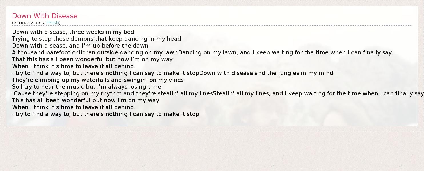 Down with disease, three weeks in my bed Trying to stop these demons that keep dancing in my head Down with disease, and I'm up before the dawn A thousand barefoot children outside dancing on my lawnDancing on my lawn, and I keep waiting for the time when I can finally say That this has all been wonderful but now I'm on my way When I think it's time to leave it all behind I try to find a way to, but there's nothing I can say to make it stopDown with disease and the jungles in my mind They're climbing up my waterfalls and swingin' on my vines So I try to hear the music but I'm always losing time 'Cause they're stepping on my rhythm and they're stealin' all my linesStealin' all my lines, and I keep waiting for the time when I can finally say This has all been wonderful but now I'm on my way When I think it's time to leave it all behind I try to find a way to, but there's nothing I can say to make it stop