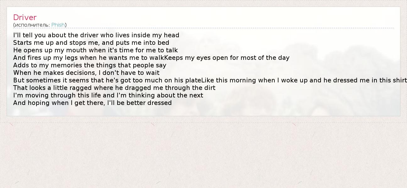 I'll tell you about the driver who lives inside my head Starts me up and stops me, and puts me into bed He opens up my mouth when it's time for me to talk And fires up my legs when he wants me to walkKeeps my eyes open for most of the day Adds to my memories the things that people say When he makes decisions, I don't have to wait But sometimes it seems that he's got too much on his plateLike this morning when I woke up and he dressed me in this shirt That looks a little ragged where he dragged me through the dirt I'm moving through this life and I'm thinking about the next And hoping when I get there, I'll be better dressed