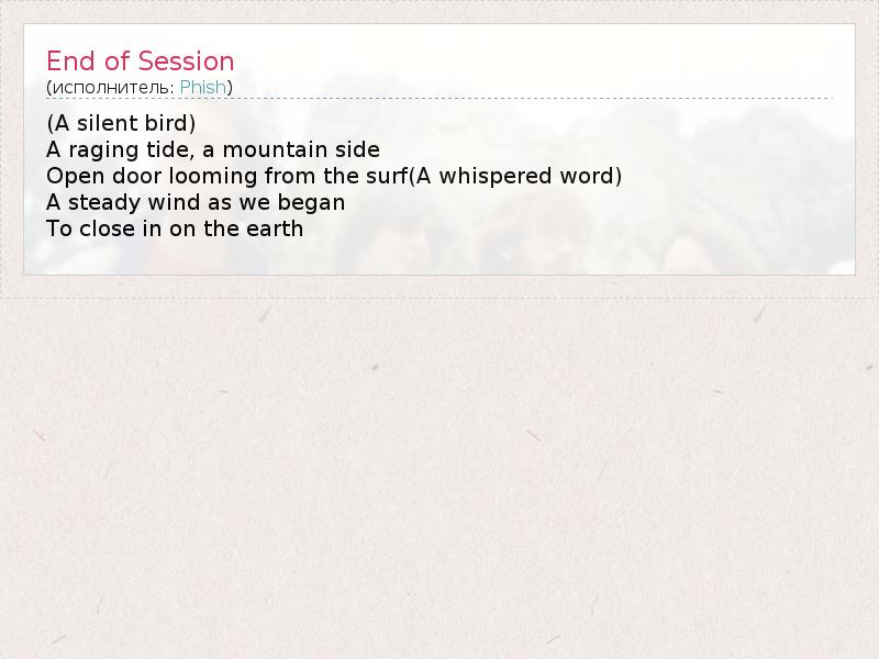 Это интересно:Phish — американская рок-группа, примечательная своими джем-сейшнами, импровизациями и постмодернистским смешением жанров. Phish была образована в 1983 году в университете Вермонта. Четыре ее участника выступали вместе 21 год, пока не распались в августе 2004 года. Их музыка содержала в себе элементы широкoго спектра жанров, и каждый их концерт был оригинальным в плане исполнения песен, порядка... продолжение