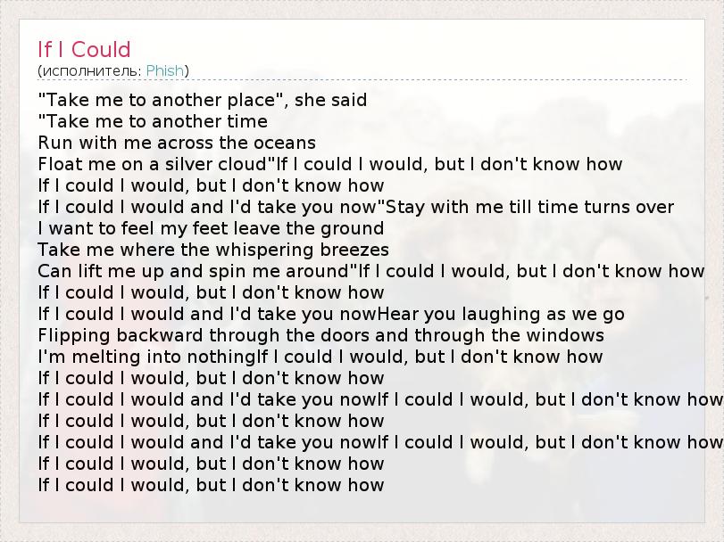 "Take me to another place", she said "Take me to another time Run with me across the oceans Float me on a silver cloud"If I could I would, but I don't know how If I could I would, but I don't know how If I could I would and I'd take you now"Stay with me till time turns over I want to feel my feet leave the ground Take me where the whispering breezes Can lift me up and spin me around"If I could I would, but I don't know how If I could I would, but I don't know how If I could I would and I'd take you nowHear you laughing as we go Flipping backward through the doors and through the windows I'm melting into nothingIf I could I would, but I don't know how If I could I would, but I don't know how If I could I would and I'd take you nowIf I could I would, but I don't know how If I could I would, but I don't know how If I could I would and I'd take you nowIf I could I would, but I don't know how If I could I would, but I don't know how If I could I would, but I don't know how