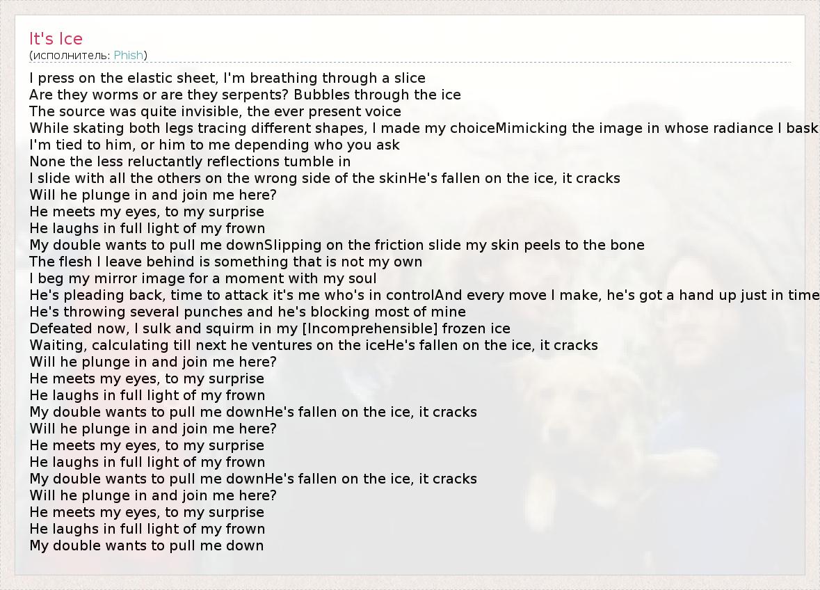 I press on the elastic sheet, I'm breathing through a slice Are they worms or are they serpents? Bubbles through the ice The source was quite invisible, the ever present voice While skating both legs tracing different shapes, I made my choiceMimicking the image in whose radiance I bask I'm tied to him, or him to me depending who you ask None the less reluctantly reflections tumble in I slide with all the others on the wrong side of the skinHe's fallen on the ice, it cracks Will he plunge in and join me here? He meets my eyes, to my surprise He laughs in full light of my frown My double wants to pull me downSlipping on the friction slide my skin peels to the bone The flesh I leave behind is something that is not my own I beg my mirror image for a moment with my soul He's pleading back, time to attack it's me who's in controlAnd every move I make, he's got a hand up just in time He's throwing several punches and he's blocking most of mine Defeated now, I sulk and squirm in my [Incomprehensible] frozen ice Waiting, calculating till next he ventures on the iceHe's fallen on the ice, it cracks Will he plunge in and join me here? He meets my eyes, to my surprise He laughs in full light of my frown My double wants to pull me downHe's fallen on the ice, it cracks Will he plunge in and join me here? He meets my eyes, to my surprise He laughs in full light of my frown My double wants to pull me downHe's fallen on the ice, it cracks Will he plunge in and join me here? He meets my eyes, to my surprise He laughs in full light of my frown My double wants to pull me down