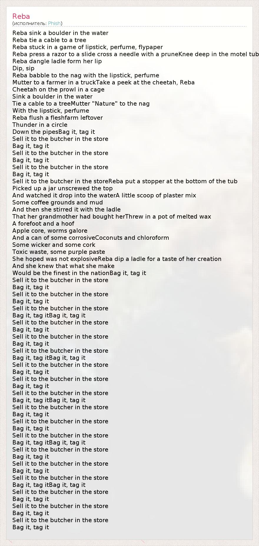 Reba sink a boulder in the water Reba tie a cable to a tree Reba stuck in a game of lipstick, perfume, flypaper Reba press a razor to a slide cross a needle with a pruneKnee deep in the motel tub Reba dangle ladle form her lip Dip, sip Reba babble to the nag with the lipstick, perfume Mutter to a farmer in a truckTake a peek at the cheetah, Reba Cheetah on the prowl in a cage Sink a boulder in the water Tie a cable to a treeMutter "Nature" to the nag With the lipstick, perfume Reba flush a fleshfarm leftover Thunder in a circle Down the pipesBag it, tag it Sell it to the butcher in the store Bag it, tag it Sell it to the butcher in the store Bag it, tag it Sell it to the butcher in the store Bag it, tag it Sell it to the butcher in the storeReba put a stopper at the bottom of the tub Picked up a jar unscrewed the top And watched it drop into the waterA little scoop of plaster mix Some coffee grounds and mud And then she stirred it with the ladle That her grandmother had bought herThrew in a pot of melted wax A forefoot and a hoof Apple core, worms galore And a can of some corrosiveCoconuts and chloroform Some wicker and some cork Toxic waste, some purple paste She hoped was not explosiveReba dip a ladle for a taste of her creation And she knew that what she make Would be the finest in the nationBag it, tag it Sell it to the butcher in the store Bag it, tag it Sell it to the butcher in the store Bag it, tag it Sell it to the butcher in the store Bag it, tag itBag it, tag it Sell it to the butcher in the store Bag it, tag it Sell it to the butcher in the store Bag it, tag it Sell it to the butcher in the store Bag it, tag itBag it, tag it Sell it to the butcher in the store Bag it, tag it Sell it to the butcher in the store Bag it, tag it Sell it to the butcher in the store Bag it, tag itBag it, tag it Sell it to the butcher in the store Bag it, tag it Sell it to the butcher in the store Bag it, tag it Sell it to the butcher in the store Bag it, tag itBag it, tag it Sell it to the butcher in the store Bag it, tag it Sell it to the butcher in the store Bag it, tag it Sell it to the butcher in the store Bag it, tag itBag it, tag it Sell it to the butcher in the store Bag it, tag it Sell it to the butcher in the store Bag it, tag it Sell it to the butcher in the store Bag it, tag it