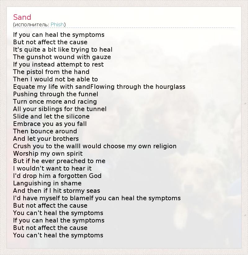 If you can heal the symptoms But not affect the cause It's quite a bit like trying to heal The gunshot wound with gauze If you instead attempt to rest The pistol from the hand Then I would not be able to Equate my life with sandFlowing through the hourglass Pushing through the funnel Turn once more and racing All your siblings for the tunnel Slide and let the silicone Embrace you as you fall Then bounce around And let your brothers Crush you to the wallI would choose my own religion Worship my own spirit But if he ever preached to me I wouldn't want to hear it I'd drop him a forgotten God Languishing in shame And then if I hit stormy seas I'd have myself to blameIf you can heal the symptoms But not affect the cause You can't heal the symptoms If you can heal the symptoms But not affect the cause You can't heal the symptoms