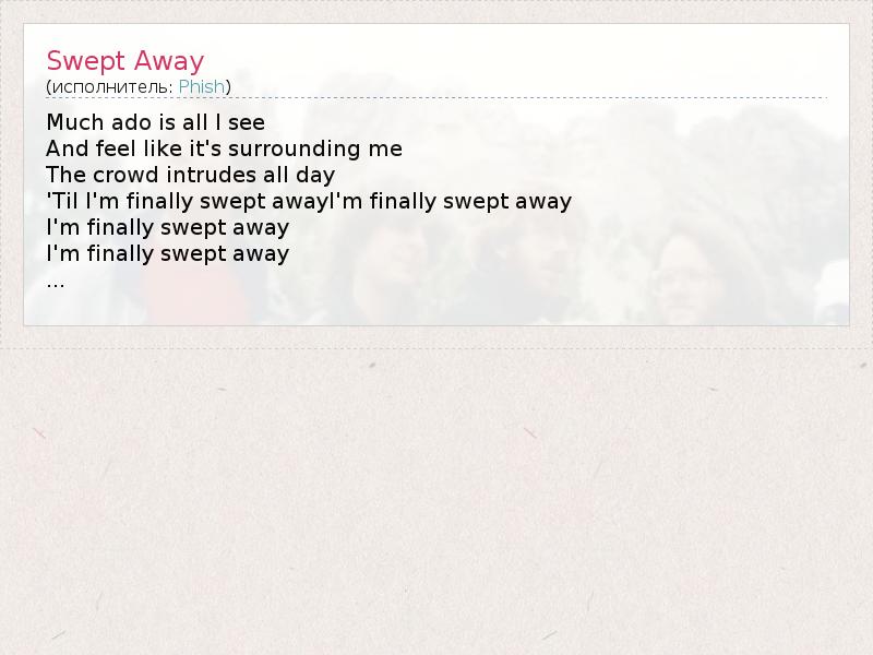 Much ado is all I see And feel like it's surrounding me The crowd intrudes all day 'Til I'm finally swept awayI'm finally swept away I'm finally swept away I'm finally swept away ...