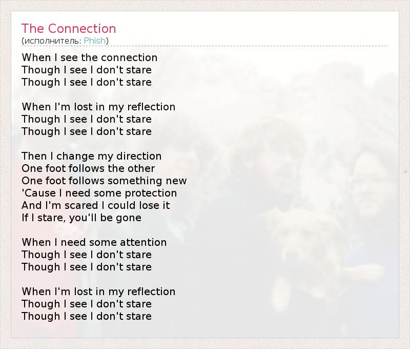 When I see the connection Though I see I don't stare Though I see I don't stare When I'm lost in my reflection Though I see I don't stare Though I see I don't stare Then I change my direction One foot follows the other One foot follows something new 'Cause I need some protection And I'm scared I could lose it If I stare, you'll be gone When I need some attention Though I see I don't stare Though I see I don't stare When I'm lost in my reflection Though I see I don't stare Though I see I don't stare