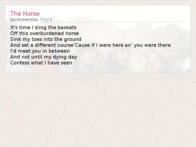 Это интересно:Phish — американская рок-группа, примечательная своими джем-сейшнами, импровизациями и постмодернистским смешением жанров. Phish была образована в 1983 году в университете Вермонта. Четыре ее участника выступали вместе 21 год, пока не распались в августе 2004 года. Их музыка содержала в себе элементы широкoго спектра жанров, и каждый их концерт был оригинальным в плане исполнения песен, порядка... продолжение
