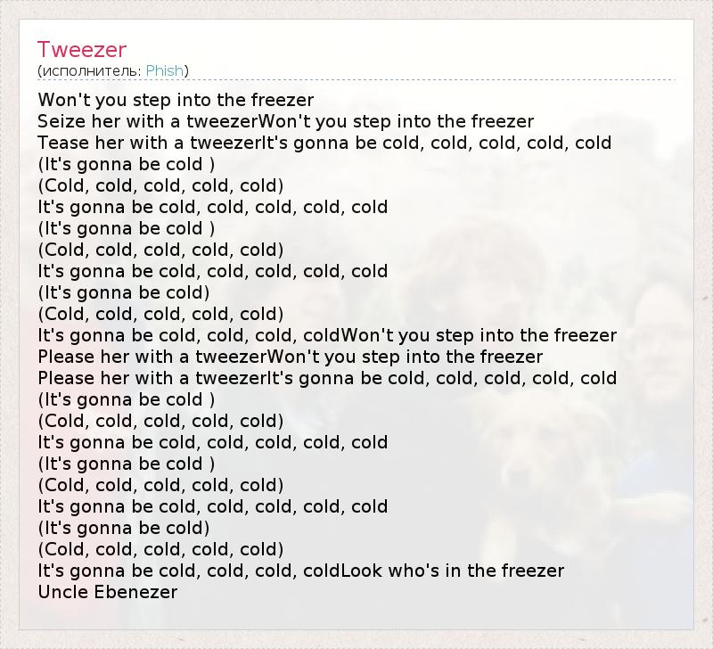 Won't you step into the freezer Seize her with a tweezerWon't you step into the freezer Tease her with a tweezerIt's gonna be cold, cold, cold, cold, cold (It's gonna be cold ) (Cold, cold, cold, cold, cold) It's gonna be cold, cold, cold, cold, cold (It's gonna be cold ) (Cold, cold, cold, cold, cold) It's gonna be cold, cold, cold, cold, cold (It's gonna be cold) (Cold, cold, cold, cold, cold) It's gonna be cold, cold, cold, coldWon't you step into the freezer Please her with a tweezerWon't you step into the freezer Please her with a tweezerIt's gonna be cold, cold, cold, cold, cold (It's gonna be cold ) (Cold, cold, cold, cold, cold) It's gonna be cold, cold, cold, cold, cold (It's gonna be cold ) (Cold, cold, cold, cold, cold) It's gonna be cold, cold, cold, cold, cold (It's gonna be cold) (Cold, cold, cold, cold, cold) It's gonna be cold, cold, cold, coldLook who's in the freezer Uncle Ebenezer