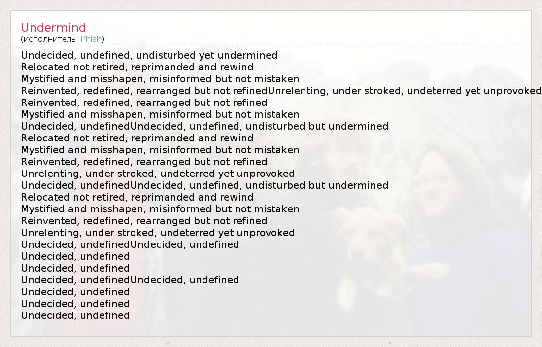 Это интересно:Phish — американская рок-группа, примечательная своими джем-сейшнами, импровизациями и постмодернистским смешением жанров. Phish была образована в 1983 году в университете Вермонта. Четыре ее участника выступали вместе 21 год, пока не распались в августе 2004 года. Их музыка содержала в себе элементы широкoго спектра жанров, и каждый их концерт был оригинальным в плане исполнения песен, порядка... продолжение