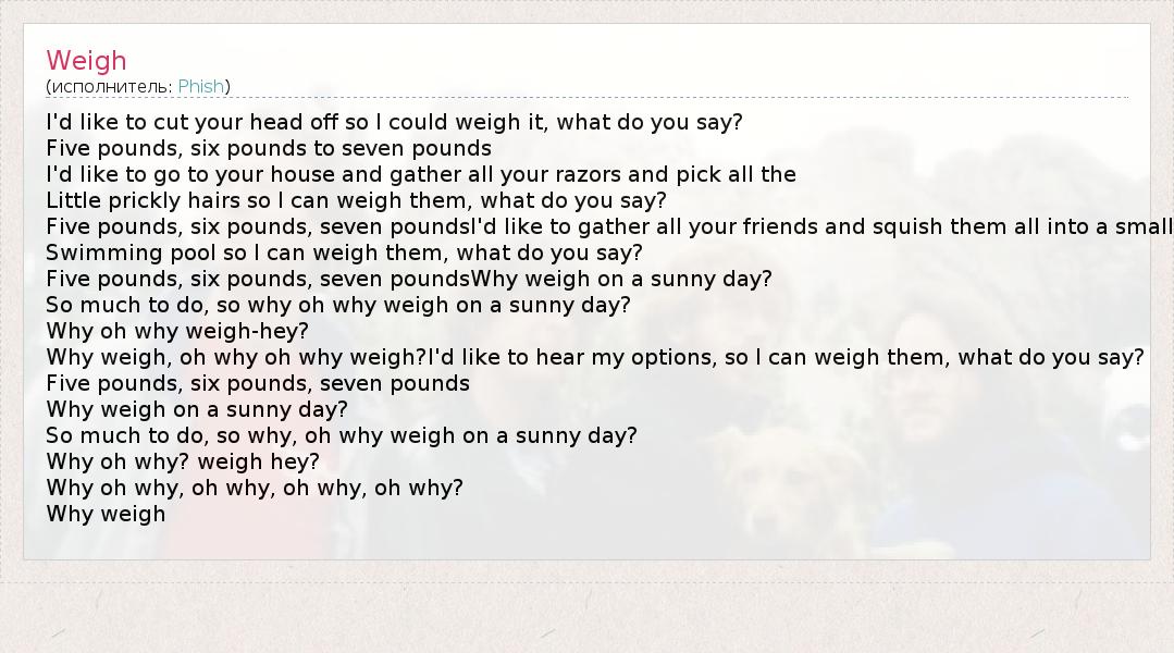I'd like to cut your head off so I could weigh it, what do you say? Five pounds, six pounds to seven pounds I'd like to go to your house and gather all your razors and pick all the Little prickly hairs so I can weigh them, what do you say? Five pounds, six pounds, seven poundsI'd like to gather all your friends and squish them all into a small Swimming pool so I can weigh them, what do you say? Five pounds, six pounds, seven poundsWhy weigh on a sunny day? So much to do, so why oh why weigh on a sunny day? Why oh why weigh-hey? Why weigh, oh why oh why weigh?I'd like to hear my options, so I can weigh them, what do you say? Five pounds, six pounds, seven pounds Why weigh on a sunny day? So much to do, so why, oh why weigh on a sunny day? Why oh why? weigh hey? Why oh why, oh why, oh why, oh why? Why weigh