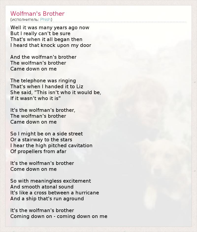 Well it was many years ago now But I really can't be sure That's when it all began then I heard that knock upon my door And the wolfman's brother The wolfman's brother Came down on me The telephone was ringing That's when I handed it to Liz She said, "This isn't who it would be, If it wasn't who it is" It's the wolfman's brother, The wolfman's brother Came down on me So I might be on a side street Or a stairway to the stars I hear the high pitched cavitation Of propellers from afar It's the wolfman's brother Come down on me So with meaningless excitement And smooth atonal sound It's like a cross between a hurricane And a ship that's run aground It's the wolfman's brother Coming down on - coming down on me