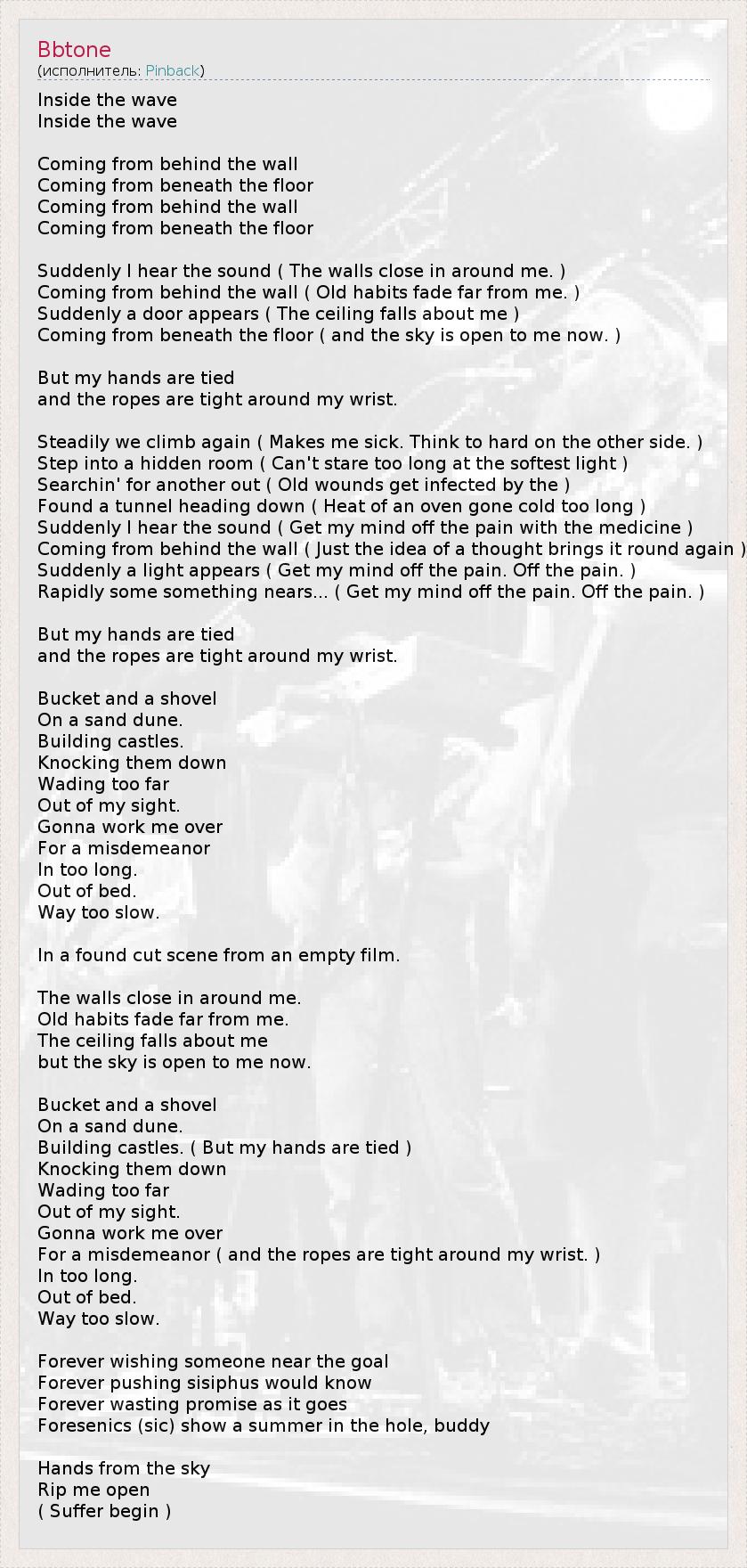 Inside the wave Inside the wave Coming from behind the wall Coming from beneath the floor Coming from behind the wall Coming from beneath the floor Suddenly I hear the sound ( The walls close in around me. ) Coming from behind the wall ( Old habits fade far from me. ) Suddenly a door appears ( The ceiling falls about me ) Coming from beneath the floor ( and the sky is open to me now. ) But my hands are tied and the ropes are tight around my wrist. Steadily we climb again ( Makes me sick. Think to hard on the other side. ) Step into a hidden room ( Can't stare too long at the softest light ) Searchin' for another out ( Old wounds get infected by the ) Found a tunnel heading down ( Heat of an oven gone cold too long ) Suddenly I hear the sound ( Get my mind off the pain with the medicine ) Coming from behind the wall ( Just the idea of a thought brings it round again ) Suddenly a light appears ( Get my mind off the pain. Off the pain. ) Rapidly some something nears... ( Get my mind off the pain. Off the pain. ) But my hands are tied and the ropes are tight around my wrist. Bucket and a shovel On a sand dune. Building castles. Knocking them down Wading too far Out of my sight. Gonna work me over For a misdemeanor In too long. Out of bed. Way too slow. In a found cut scene from an empty film. The walls close in around me. Old habits fade far from me. The ceiling falls about me but the sky is open to me now. Bucket and a shovel On a sand dune. Building castles. ( But my hands are tied ) Knocking them down Wading too far Out of my sight. Gonna work me over For a misdemeanor ( and the ropes are tight around my wrist. ) In too long. Out of bed. Way too slow. Forever wishing someone near the goal Forever pushing sisiphus would know Forever wasting promise as it goes Foresenics (sic) show a summer in the hole, buddy Hands from the sky Rip me open ( Suffer begin )