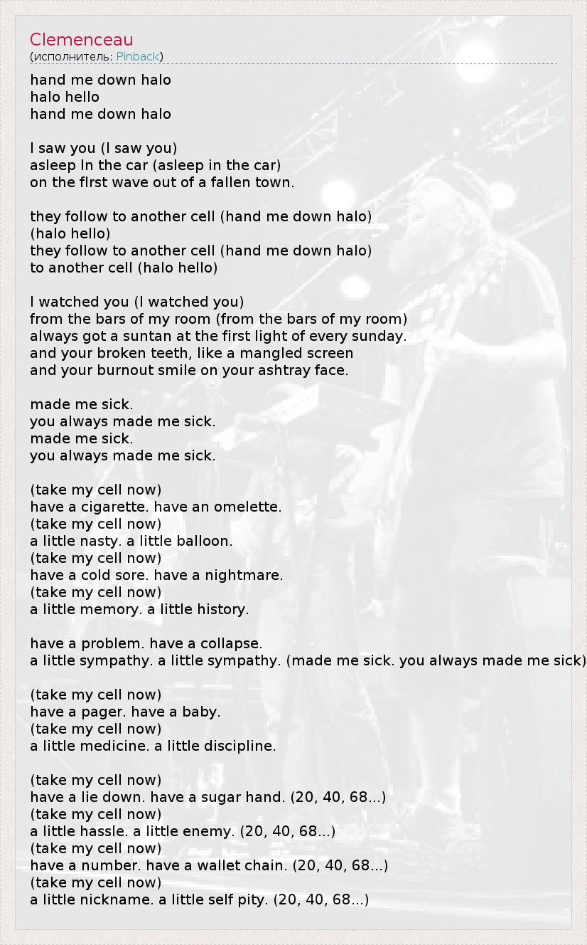 hand me down halo halo hello hand me down halo I saw you (I saw you) asleep In the car (asleep in the car) on the fIrst wave out of a fallen town. they follow to another cell (hand me down halo) (halo hello) they follow to another cell (hand me down halo) to another cell (halo hello) I watched you (I watched you) from the bars of my room (from the bars of my room) always got a suntan at the first light of every sunday. and your broken teeth, like a mangled screen and your burnout smile on your ashtray face. made me sick. you always made me sick. made me sick. you always made me sick. (take my cell now) have a cigarette. have an omelette. (take my cell now) a little nasty. a little balloon. (take my cell now) have a cold sore. have a nightmare. (take my cell now) a little memory. a little history. have a problem. have a collapse. a little sympathy. a little sympathy. (made me sick. you always made me sick) (take my cell now) have a pager. have a baby. (take my cell now) a little medicine. a little discipline. (take my cell now) have a lie down. have a sugar hand. (20, 40, 68...) (take my cell now) a little hassle. a little enemy. (20, 40, 68...) (take my cell now) have a number. have a wallet chain. (20, 40, 68...) (take my cell now) a little nickname. a little self pity. (20, 40, 68...)