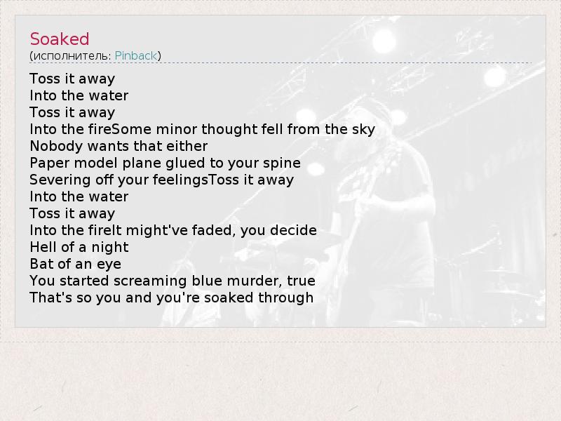 Toss it away Into the water Toss it away Into the fireSome minor thought fell from the sky Nobody wants that either Paper model plane glued to your spine Severing off your feelingsToss it away Into the water Toss it away Into the fireIt might've faded, you decide Hell of a night Bat of an eye You started screaming blue murder, true That's so you and you're soaked through