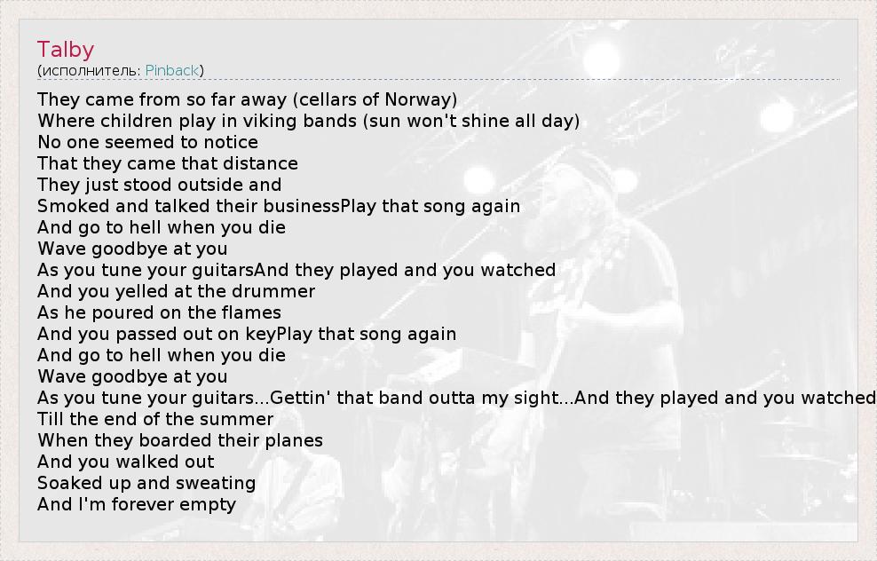 They came from so far away (cellars of Norway) Where children play in viking bands (sun won't shine all day) No one seemed to notice That they came that distance They just stood outside and Smoked and talked their businessPlay that song again And go to hell when you die Wave goodbye at you As you tune your guitarsAnd they played and you watched And you yelled at the drummer As he poured on the flames And you passed out on keyPlay that song again And go to hell when you die Wave goodbye at you As you tune your guitars...Gettin' that band outta my sight...And they played and you watched Till the end of the summer When they boarded their planes And you walked out Soaked up and sweating And I'm forever empty