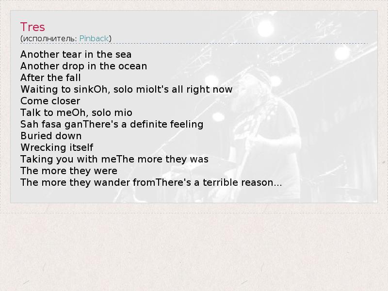 Another tear in the sea Another drop in the ocean After the fall Waiting to sinkOh, solo mioIt's all right now Come closer Talk to meOh, solo mio Sah fasa ganThere's a definite feeling Buried down Wrecking itself Taking you with meThe more they was The more they were The more they wander fromThere's a terrible reason...