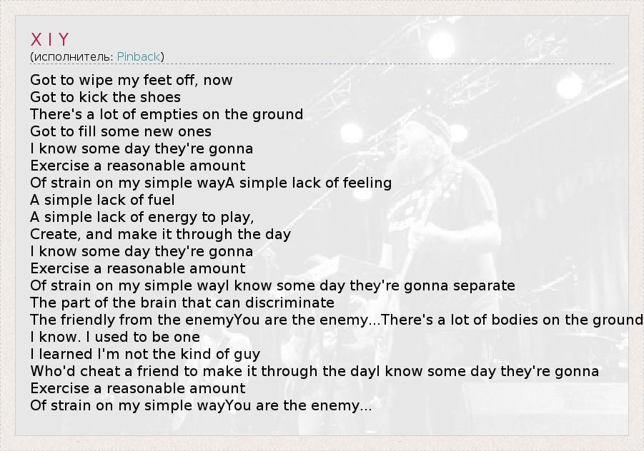 Got to wipe my feet off, now Got to kick the shoes There's a lot of empties on the ground Got to fill some new ones I know some day they're gonna Exercise a reasonable amount Of strain on my simple wayA simple lack of feeling A simple lack of fuel A simple lack of energy to play, Create, and make it through the day I know some day they're gonna Exercise a reasonable amount Of strain on my simple wayI know some day they're gonna separate The part of the brain that can discriminate The friendly from the enemyYou are the enemy...There's a lot of bodies on the ground I know. I used to be one I learned I'm not the kind of guy Who'd cheat a friend to make it through the dayI know some day they're gonna Exercise a reasonable amount Of strain on my simple wayYou are the enemy...