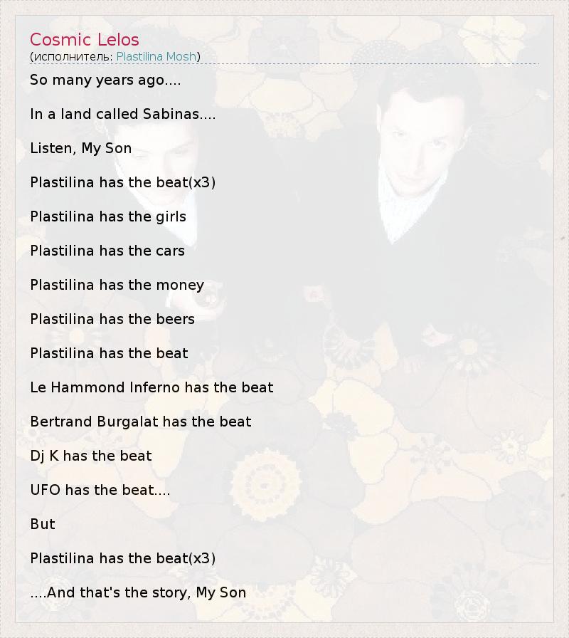 So many years ago.... In a land called Sabinas.... Listen, My Son Plastilina has the beat(x3) Plastilina has the girls Plastilina has the cars Plastilina has the money Plastilina has the beers Plastilina has the beat Le Hammond Inferno has the beat Bertrand Burgalat has the beat Dj K has the beat UFO has the beat.... But Plastilina has the beat(x3) ....And that's the story, My Son