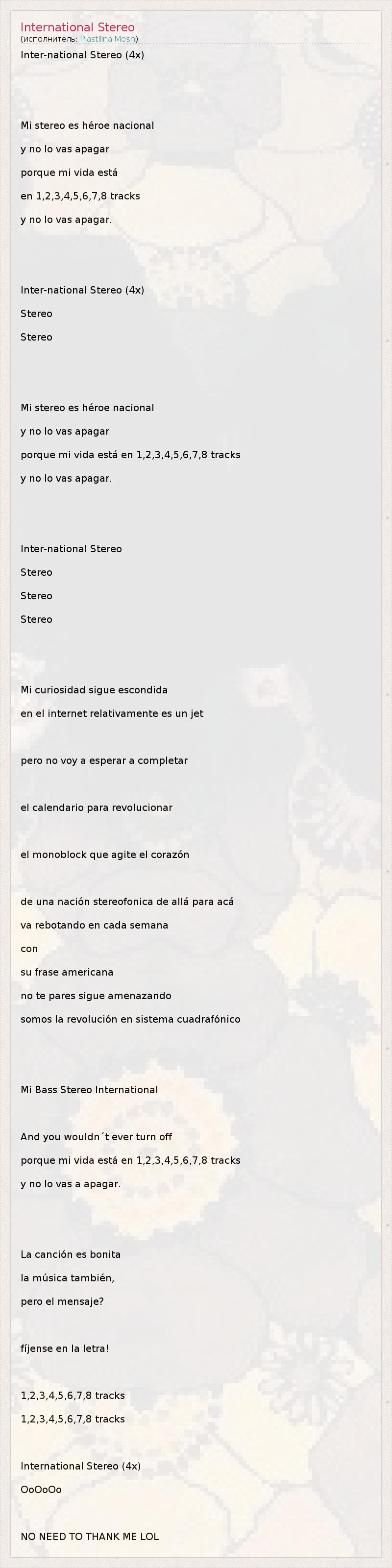 Inter-national Stereo (4x) Mi stereo es héroe nacional y no lo vas apagar porque mi vida está en 1,2,3,4,5,6,7,8 tracks y no lo vas apagar. Inter-national Stereo (4x) Stereo Stereo Mi stereo es héroe nacional y no lo vas apagar porque mi vida está en 1,2,3,4,5,6,7,8 tracks y no lo vas apagar. Inter-national Stereo Stereo Stereo Stereo Mi curiosidad sigue escondida en el internet relativamente es un jet pero no voy a esperar a completar el calendario para revolucionar el monoblock que agite el corazón de una nación stereofonica de allá para acá va rebotando en cada semana con su frase americana no te pares sigue amenazando somos la revolución en sistema cuadrafónico Mi Bass Stereo International And you wouldn´t ever turn off porque mi vida está en 1,2,3,4,5,6,7,8 tracks y no lo vas a apagar. La canción es bonita la música también, pero el mensaje? fíjense en la letra! 1,2,3,4,5,6,7,8 tracks 1,2,3,4,5,6,7,8 tracks International Stereo (4x) OoOoOo NO NEED TO THANK ME LOL