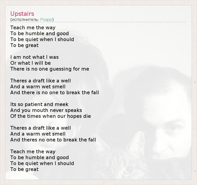 Teach me the way To be humble and good To be quiet when I should To be great I am not what I was Or what I will be There is no one guessing for me Theres a draft like a well And a warm wet smell And there is no one to break the fall Its so patient and meek And you mouth never speaks Of the times when our hopes die Theres a draft like a well And a warm wet smell And theres no one to break the fall Teach me the way To be humble and good To be quiet when I should To be great