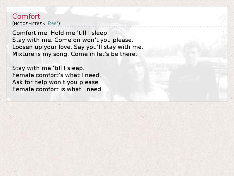 Comfort me. Hold me 'till I sleep. Stay with me. Come on won't you please. Loosen up your love. Say you'll stay with me. Mixture is my song. Come in let's be there. Stay with me 'till I sleep. Female comfort's what I need. Ask for help won't you please. Female comfort is what I need.