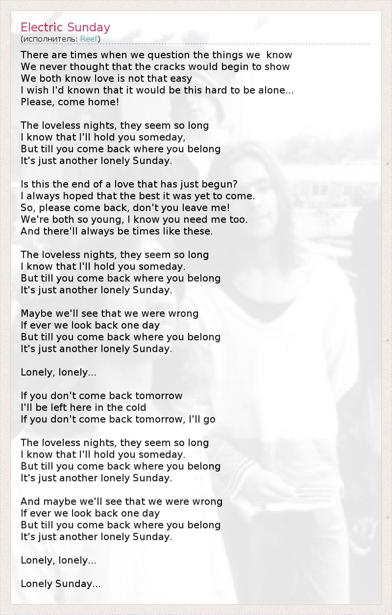 Порой мы сомневаемся даже в том, что знаем наверняка, Мы и не подозревали, что когда-нибудь все может пойти по швам, Нам известно, что любить – не так-то просто, Но жаль, что я не понимал, как трудно быть одному... Прошу, вернись!!! Ночи без любви кажутся невыносимо длинными, Знаю, что обниму тебя однажды, Но пока ты не вернулась туда, где я жду тебя, Это всего лишь еще одно одинокое воскресенье. И неужели любовь кончится вот так, едва начавшись? Я всегда надеялся, что самое лучшее у нас впереди. Так прошу, вернись, только не оставляй меня! Мы так молоды, я знаю, что нужен тебе тоже. А периоды, похожие на этот, будут всегда... Без тебя ночи нестерпимо бесконечны, Конечно, однажды ты будешь моей, Но пока ты не вернулась туда, откуда ушла, Я снова задыхаюсь от одиночества в тоскливое воскресенье. Возможно, мы поймем, что были не правы, Если когда-нибудь оглянемся назад, Но пока ты не поймешь, что ты – часть меня, Я так и буду встречать воскресенье в одиночестве. Одинокое, одинокое... Если ты не вернешься завтра, Холод овладеет моим сердцем, Если ты не вернешься завтра, я уйду... Когда тебя нет, ночи мучительно тянутся веками, Да, когда-нибудь я обниму тебя, Но пока ты не вернулась туда, где ты должна быть, Снова воскресение...и одиночество стучится в мою дверь. И может быть, мы поймем, что были не правы, Если когда-нибудь оглянемся назад, Но пока ты не вернулась, туда где я тебя жду, Я снова впущу к себе воскресное одиночество. Одинокое, одинокое... Одинокое воскресенье...