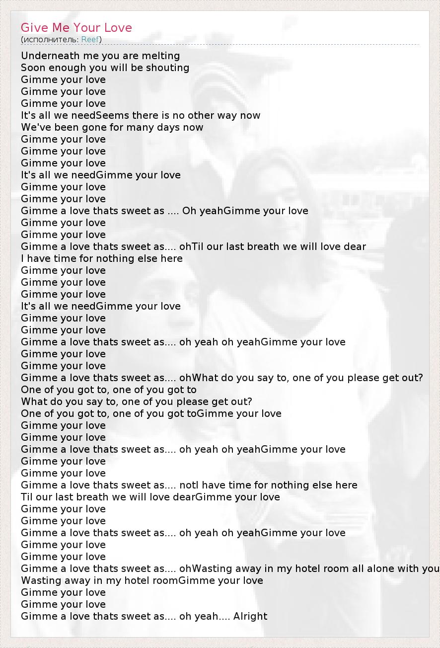 Underneath me you are melting Soon enough you will be shouting Gimme your love Gimme your love Gimme your love It's all we needSeems there is no other way now We've been gone for many days now Gimme your love Gimme your love Gimme your love It's all we needGimme your love Gimme your love Gimme your love Gimme a love thats sweet as .... Oh yeahGimme your love Gimme your love Gimme your love Gimme a love thats sweet as.... ohTil our last breath we will love dear I have time for nothing else here Gimme your love Gimme your love Gimme your love It's all we needGimme your love Gimme your love Gimme your love Gimme a love thats sweet as.... oh yeah oh yeahGimme your love Gimme your love Gimme your love Gimme a love thats sweet as.... ohWhat do you say to, one of you please get out? One of you got to, one of you got to What do you say to, one of you please get out? One of you got to, one of you got toGimme your love Gimme your love Gimme your love Gimme a love thats sweet as.... oh yeah oh yeahGimme your love Gimme your love Gimme your love Gimme a love thats sweet as.... notI have time for nothing else here Til our last breath we will love dearGimme your love Gimme your love Gimme your love Gimme a love thats sweet as.... oh yeah oh yeahGimme your love Gimme your love Gimme your love Gimme a love thats sweet as.... ohWasting away in my hotel room all alone with you Wasting away in my hotel roomGimme your love Gimme your love Gimme your love Gimme a love thats sweet as.... oh yeah.... Alright