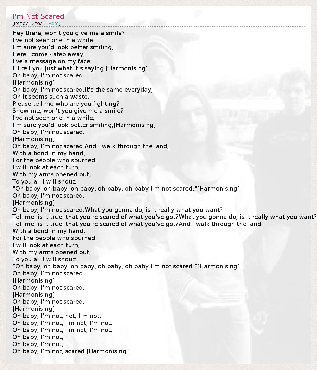 Hey there, won't you give me a smile? I've not seen one in a while. I'm sure you'd look better smiling, Here I come - step away, I've a message on my face, I'll tell you just what it's saying.[Harmonising] Oh baby, I'm not scared. [Harmonising] Oh baby, I'm not scared.It's the same everyday, Oh it seems such a waste, Please tell me who are you fighting? Show me, won't you give me a smile? I've not seen one in a while, I'm sure you'd look better smiling,[Harmonising] Oh baby, I'm not scared. [Harmonising] Oh baby, I'm not scared.And I walk through the land, With a bond in my hand, For the people who spurned, I will look at each turn, With my arms opened out, To you all I will shout: "Oh baby, oh baby, oh baby, oh baby, oh baby I'm not scared."[Harmonising] Oh baby, I'm not scared. [Harmonising] Oh baby, I'm not scared.What you gonna do, is it really what you want? Tell me, is it true, that you're scared of what you've got?What you gonna do, is it really what you want? Tell me, is it true, that you're scared of what you've got?And I walk through the land, With a bond in my hand, For the people who spurned, I will look at each turn, With my arms opened out, To you all I will shout: "Oh baby, oh baby, oh baby, oh baby, oh baby I'm not scared."[Harmonising] Oh baby, I'm not scared. [Harmonising] Oh baby, I'm not scared. [Harmonising] Oh baby, I'm not scared. [Harmonising] Oh baby, I'm not, not, I'm not, Oh baby, I'm not, I'm not, I'm not, Oh baby, I'm not, I'm not, I'm not, Oh baby, I'm not, Oh baby, I'm not, Oh baby, I'm not, scared.[Harmonising]