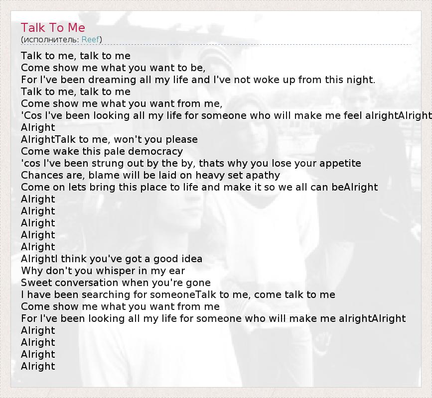 Talk to me, talk to me Come show me what you want to be, For I've been dreaming all my life and I've not woke up from this night. Talk to me, talk to me Come show me what you want from me, 'Cos I've been looking all my life for someone who will make me feel alrightAlright Alright AlrightTalk to me, won't you please Come wake this pale democracy 'cos I've been strung out by the by, thats why you lose your appetite Chances are, blame will be laid on heavy set apathy Come on lets bring this place to life and make it so we all can beAlright Alright Alright Alright Alright Alright AlrightI think you've got a good idea Why don't you whisper in my ear Sweet conversation when you're gone I have been searching for someoneTalk to me, come talk to me Come show me what you want from me For I've been looking all my life for someone who will make me alrightAlright Alright Alright Alright Alright