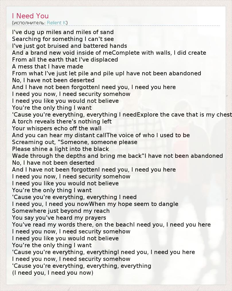 I've dug up miles and miles of sand Searching for something I can't see I've just got bruised and battered hands And a brand new void inside of meComplete with walls, I did create From all the earth that I've displaced A mess that I have made From what I've just let pile and pile upI have not been abandoned No, I have not been deserted And I have not been forgottenI need you, I need you here I need you now, I need security somehow I need you like you would not believe You're the only thing I want 'Cause you're everything, everything I needExplore the cave that is my chest A torch reveals there's nothing left Your whispers echo off the wall And you can hear my distant callThe voice of who I used to be Screaming out, "Someone, someone please Please shine a light into the black Wade through the depths and bring me back"I have not been abandoned No, I have not been deserted And I have not been forgottenI need you, I need you here I need you now, I need security somehow I need you like you would not believe You're the only thing I want 'Cause you're everything, everything I need I need you, I need you nowWhen my hope seem to dangle Somewhere just beyond my reach You say you've heard my prayers You've read my words there, on the beachI need you, I need you here I need you now, I need security somehow I need you like you would not believe You're the only thing I want 'Cause you're everything, everythingI need you, I need you here I need you now, I need security somehow 'Cause you're everything, everything, everything (I need you, I need you now)