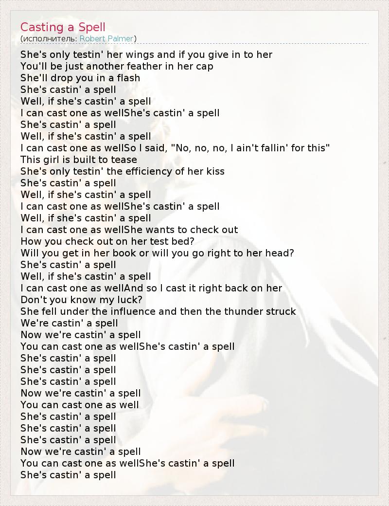 She's only testin' her wings and if you give in to her You'll be just another feather in her cap She'll drop you in a flash She's castin' a spell Well, if she's castin' a spell I can cast one as wellShe's castin' a spell She's castin' a spell Well, if she's castin' a spell I can cast one as wellSo I said, "No, no, no, I ain't fallin' for this" This girl is built to tease She's only testin' the efficiency of her kiss She's castin' a spell Well, if she's castin' a spell I can cast one as wellShe's castin' a spell Well, if she's castin' a spell I can cast one as wellShe wants to check out How you check out on her test bed? Will you get in her book or will you go right to her head? She's castin' a spell Well, if she's castin' a spell I can cast one as wellAnd so I cast it right back on her Don't you know my luck? She fell under the influence and then the thunder struck We're castin' a spell Now we're castin' a spell You can cast one as wellShe's castin' a spell She's castin' a spell She's castin' a spell She's castin' a spell Now we're castin' a spell You can cast one as well She's castin' a spell She's castin' a spell She's castin' a spell Now we're castin' a spell You can cast one as wellShe's castin' a spell She's castin' a spell
