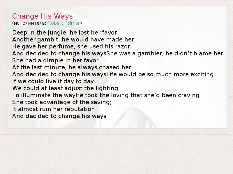 А как ты думаешь, о чем песня "Change His Ways" ?