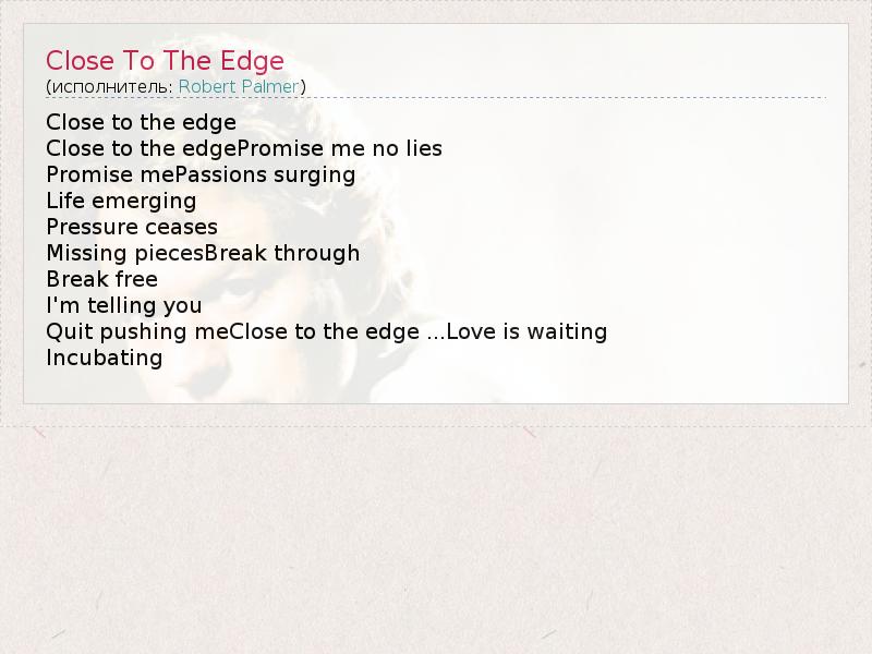 Close to the edge Close to the edgePromise me no lies Promise mePassions surging Life emerging Pressure ceases Missing piecesBreak through Break free I'm telling you Quit pushing meClose to the edge ...Love is waiting Incubating