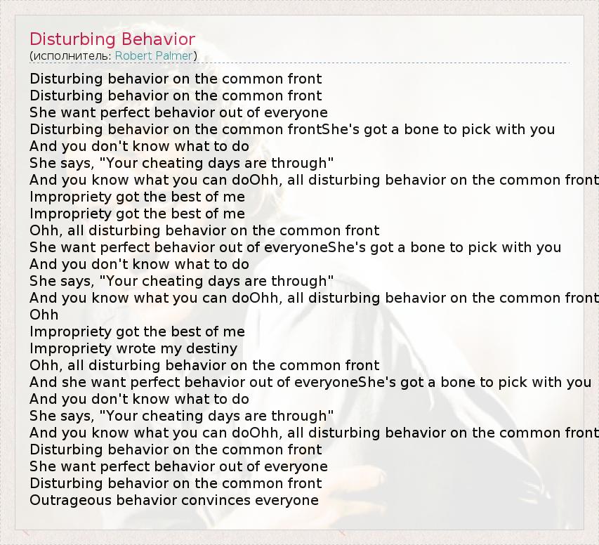 Disturbing behavior on the common front Disturbing behavior on the common front She want perfect behavior out of everyone Disturbing behavior on the common frontShe's got a bone to pick with you And you don't know what to do She says, "Your cheating days are through" And you know what you can doOhh, all disturbing behavior on the common front Impropriety got the best of me Impropriety got the best of me Ohh, all disturbing behavior on the common front She want perfect behavior out of everyoneShe's got a bone to pick with you And you don't know what to do She says, "Your cheating days are through" And you know what you can doOhh, all disturbing behavior on the common front Ohh Impropriety got the best of me Impropriety wrote my destiny Ohh, all disturbing behavior on the common front And she want perfect behavior out of everyoneShe's got a bone to pick with you And you don't know what to do She says, "Your cheating days are through" And you know what you can doOhh, all disturbing behavior on the common front Disturbing behavior on the common front She want perfect behavior out of everyone Disturbing behavior on the common front Outrageous behavior convinces everyone