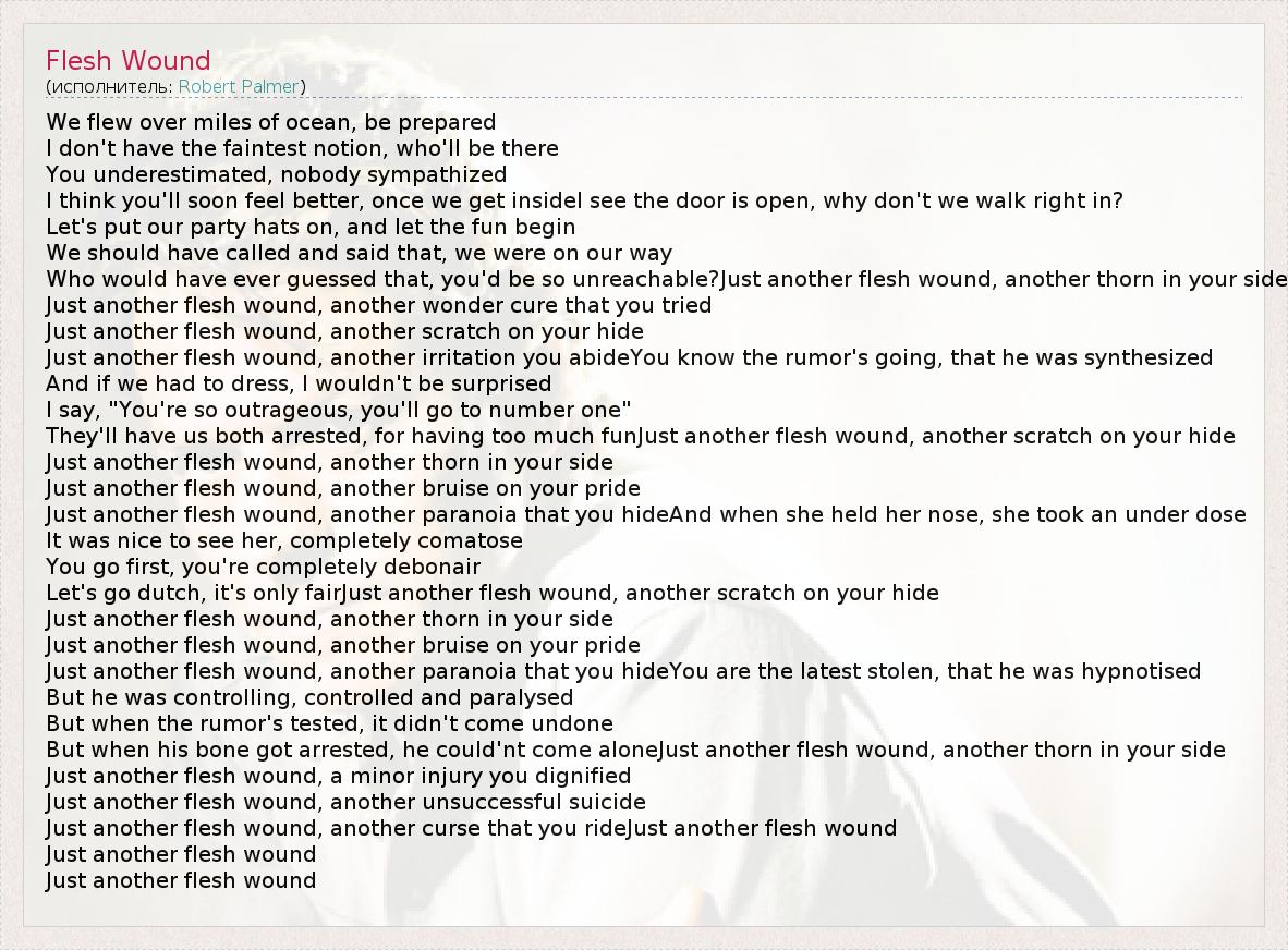 We flew over miles of ocean, be prepared I don't have the faintest notion, who'll be there You underestimated, nobody sympathized I think you'll soon feel better, once we get insideI see the door is open, why don't we walk right in? Let's put our party hats on, and let the fun begin We should have called and said that, we were on our way Who would have ever guessed that, you'd be so unreachable?Just another flesh wound, another thorn in your side Just another flesh wound, another wonder cure that you tried Just another flesh wound, another scratch on your hide Just another flesh wound, another irritation you abideYou know the rumor's going, that he was synthesized And if we had to dress, I wouldn't be surprised I say, "You're so outrageous, you'll go to number one" They'll have us both arrested, for having too much funJust another flesh wound, another scratch on your hide Just another flesh wound, another thorn in your side Just another flesh wound, another bruise on your pride Just another flesh wound, another paranoia that you hideAnd when she held her nose, she took an under dose It was nice to see her, completely comatose You go first, you're completely debonair Let's go dutch, it's only fairJust another flesh wound, another scratch on your hide Just another flesh wound, another thorn in your side Just another flesh wound, another bruise on your pride Just another flesh wound, another paranoia that you hideYou are the latest stolen, that he was hypnotised But he was controlling, controlled and paralysed But when the rumor's tested, it didn't come undone But when his bone got arrested, he could'nt come aloneJust another flesh wound, another thorn in your side Just another flesh wound, a minor injury you dignified Just another flesh wound, another unsuccessful suicide Just another flesh wound, another curse that you rideJust another flesh wound Just another flesh wound Just another flesh wound