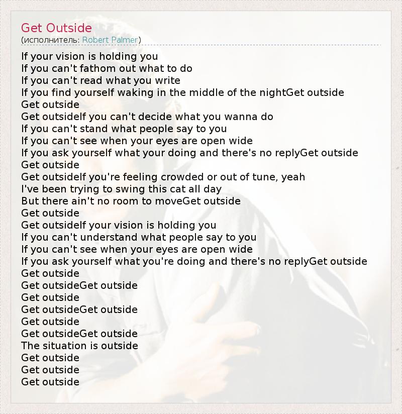 If your vision is holding you If you can't fathom out what to do If you can't read what you write If you find yourself waking in the middle of the nightGet outside Get outside Get outsideIf you can't decide what you wanna do If you can't stand what people say to you If you can't see when your eyes are open wide If you ask yourself what your doing and there's no replyGet outside Get outside Get outsideIf you're feeling crowded or out of tune, yeah I've been trying to swing this cat all day But there ain't no room to moveGet outside Get outside Get outsideIf your vision is holding you If you can't understand what people say to you If you can't see when your eyes are open wide If you ask yourself what you're doing and there's no replyGet outside Get outside Get outsideGet outside Get outside Get outsideGet outside Get outside Get outsideGet outside The situation is outside Get outside Get outside Get outside