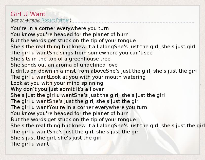 You're in a corner everywhere you turn You know you're headed for the planet of burn But the words get stuck on the tip of your tongue She's the real thing but knew it all alongShe's just the girl, she's just girl The girl u wantShe sings from somewhere you can't see She sits in the top of a greenhouse tree She sends out an aroma of undefined love It drifts on down in a mist from aboveShe's just the girl, she's just the girl The girl u wantLook at you with your mouth watering Look at you with your mind spinning Why don't you just admit it's all over She's just the girl u wantShe's just the girl, she's just the girl The girl u wantShe's just the girl, she's just the girl The girl u wantYou're in a corner everywhere you turn You know you're headed for the planet of burn But the words get stuck on the tip of your tongue She's the real thing but knew it all alongShe's just the girl, she's just the girl The girl u wantShe's just the girl, she's just the girl She's just the girl, she's just the girl The girl u want
