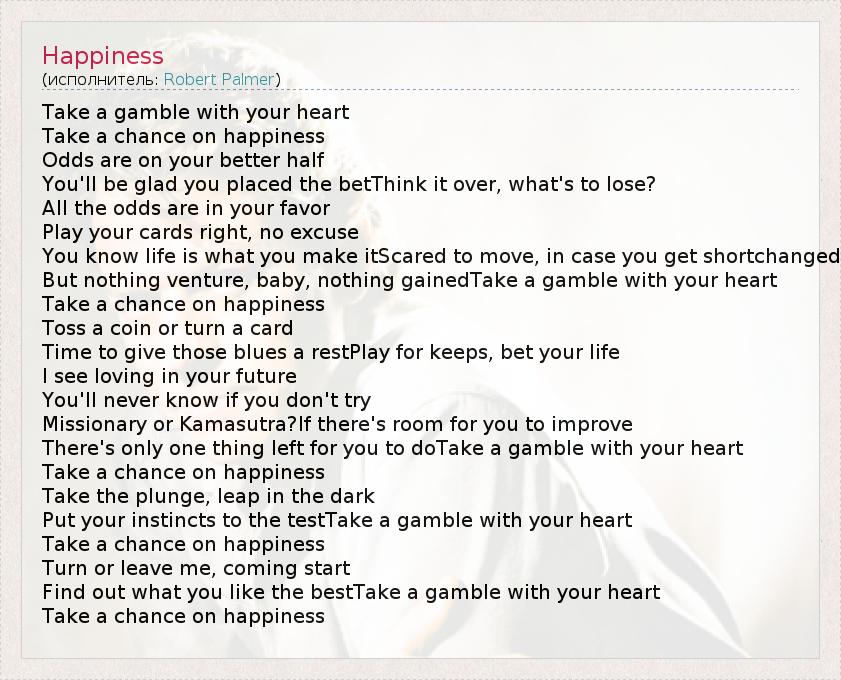 Take a gamble with your heart Take a chance on happiness Odds are on your better half You'll be glad you placed the betThink it over, what's to lose? All the odds are in your favor Play your cards right, no excuse You know life is what you make itScared to move, in case you get shortchanged But nothing venture, baby, nothing gainedTake a gamble with your heart Take a chance on happiness Toss a coin or turn a card Time to give those blues a restPlay for keeps, bet your life I see loving in your future You'll never know if you don't try Missionary or Kamasutra?If there's room for you to improve There's only one thing left for you to doTake a gamble with your heart Take a chance on happiness Take the plunge, leap in the dark Put your instincts to the testTake a gamble with your heart Take a chance on happiness Turn or leave me, coming start Find out what you like the bestTake a gamble with your heart Take a chance on happiness