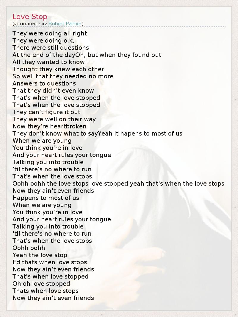They were doing all right They were doing o.k. There were still questions At the end of the dayOh, but when they found out All they wanted to know Thought they knew each other So well that they needed no more Answers to questions That they didn't even know That's when the love stopped That's when the love stopped They can't figure it out They were well on their way Now they're heartbroken They don't know what to sayYeah it hapens to most of us When we are young You think you're in love And your heart rules your tongue Talking you into trouble 'til there's no where to run That's when the love stops Oohh oohh the love stops love stopped yeah that's when the love stops Now they ain't even friends Happens to most of us When we are young You think you're in love And your heart rules your tongue Talking you into trouble 'til there's no where to run That's when the love stops Oohh oohh Yeah the love stop Ed thats when love stops Now they ain't even friends That's when love stopped Oh oh love stopped Thats when love stops Now they ain't even friends