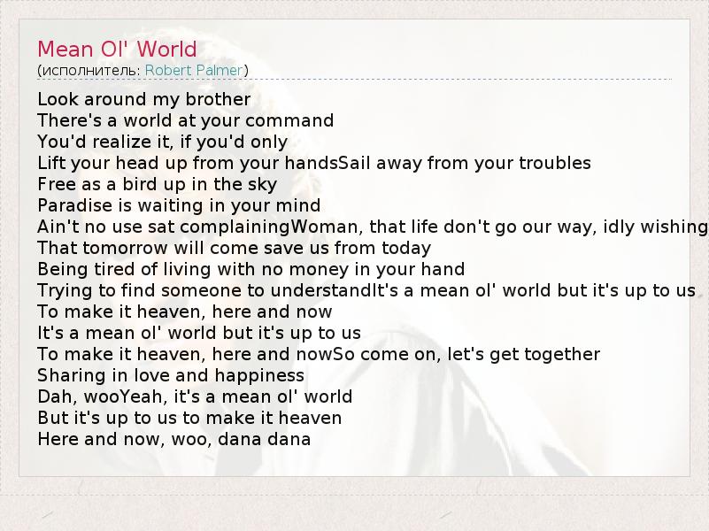 Look around my brother There's a world at your command You'd realize it, if you'd only Lift your head up from your handsSail away from your troubles Free as a bird up in the sky Paradise is waiting in your mind Ain't no use sat complainingWoman, that life don't go our way, idly wishing That tomorrow will come save us from today Being tired of living with no money in your hand Trying to find someone to understandIt's a mean ol' world but it's up to us To make it heaven, here and now It's a mean ol' world but it's up to us To make it heaven, here and nowSo come on, let's get together Sharing in love and happiness Dah, wooYeah, it's a mean ol' world But it's up to us to make it heaven Here and now, woo, dana dana