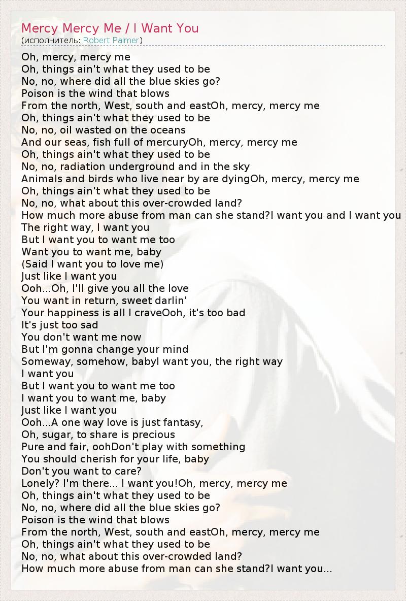 Oh, mercy, mercy me Oh, things ain't what they used to be No, no, where did all the blue skies go? Poison is the wind that blows From the north, West, south and eastOh, mercy, mercy me Oh, things ain't what they used to be No, no, oil wasted on the oceans And our seas, fish full of mercuryOh, mercy, mercy me Oh, things ain't what they used to be No, no, radiation underground and in the sky Animals and birds who live near by are dyingOh, mercy, mercy me Oh, things ain't what they used to be No, no, what about this over-crowded land? How much more abuse from man can she stand?I want you and I want you The right way, I want you But I want you to want me too Want you to want me, baby (Said I want you to love me) Just like I want you Ooh...Oh, I'll give you all the love You want in return, sweet darlin' Your happiness is all I craveOoh, it's too bad It's just too sad You don't want me now But I'm gonna change your mind Someway, somehow, babyI want you, the right way I want you But I want you to want me too I want you to want me, baby Just like I want you Ooh...A one way love is just fantasy, Oh, sugar, to share is precious Pure and fair, oohDon't play with something You should cherish for your life, baby Don't you want to care? Lonely? I'm there... I want you!Oh, mercy, mercy me Oh, things ain't what they used to be No, no, where did all the blue skies go? Poison is the wind that blows From the north, West, south and eastOh, mercy, mercy me Oh, things ain't what they used to be No, no, what about this over-crowded land? How much more abuse from man can she stand?I want you...