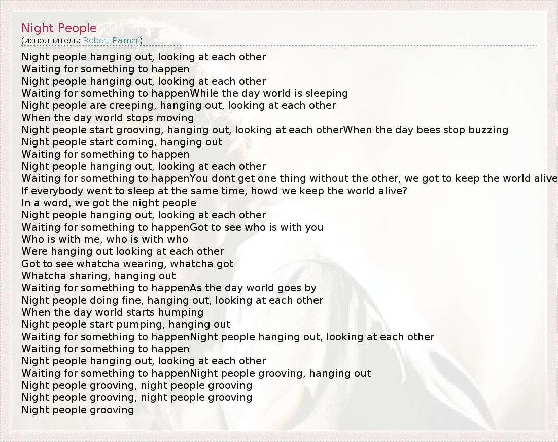 Night people hanging out, looking at each other Waiting for something to happen Night people hanging out, looking at each other Waiting for something to happenWhile the day world is sleeping Night people are creeping, hanging out, looking at each other When the day world stops moving Night people start grooving, hanging out, looking at each otherWhen the day bees stop buzzing Night people start coming, hanging out Waiting for something to happen Night people hanging out, looking at each other Waiting for something to happenYou dont get one thing without the other, we got to keep the world alive If everybody went to sleep at the same time, howd we keep the world alive? In a word, we got the night people Night people hanging out, looking at each other Waiting for something to happenGot to see who is with you Who is with me, who is with who Were hanging out looking at each other Got to see whatcha wearing, whatcha got Whatcha sharing, hanging out Waiting for something to happenAs the day world goes by Night people doing fine, hanging out, looking at each other When the day world starts humping Night people start pumping, hanging out Waiting for something to happenNight people hanging out, looking at each other Waiting for something to happen Night people hanging out, looking at each other Waiting for something to happenNight people grooving, hanging out Night people grooving, night people grooving Night people grooving, night people grooving Night people grooving