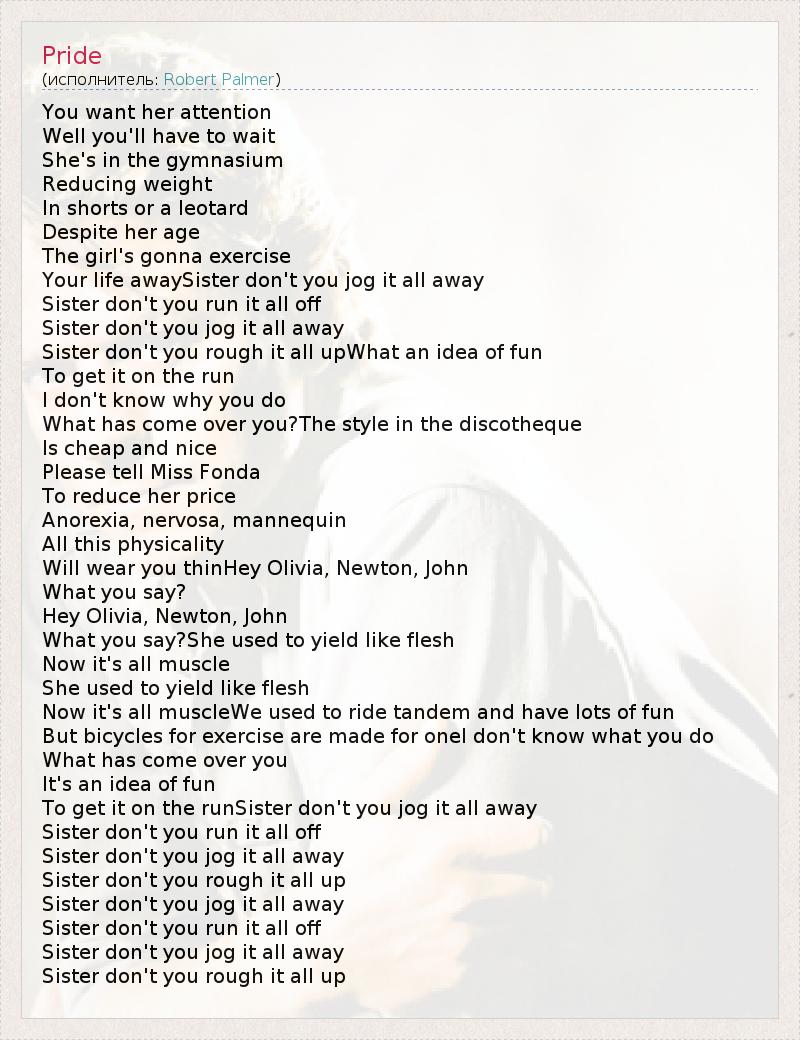 You want her attention Well you'll have to wait She's in the gymnasium Reducing weight In shorts or a leotard Despite her age The girl's gonna exercise Your life awaySister don't you jog it all away Sister don't you run it all off Sister don't you jog it all away Sister don't you rough it all upWhat an idea of fun To get it on the run I don't know why you do What has come over you?The style in the discotheque Is cheap and nice Please tell Miss Fonda To reduce her price Anorexia, nervosa, mannequin All this physicality Will wear you thinHey Olivia, Newton, John What you say? Hey Olivia, Newton, John What you say?She used to yield like flesh Now it's all muscle She used to yield like flesh Now it's all muscleWe used to ride tandem and have lots of fun But bicycles for exercise are made for oneI don't know what you do What has come over you It's an idea of fun To get it on the runSister don't you jog it all away Sister don't you run it all off Sister don't you jog it all away Sister don't you rough it all up Sister don't you jog it all away Sister don't you run it all off Sister don't you jog it all away Sister don't you rough it all up