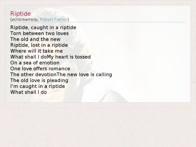 Riptide, caught in a riptide Torn between two loves The old and the new Riptide, lost in a riptide Where will it take me What shall I doMy heart is tossed On a sea of emotion One love offers romance The other devotionThe new love is calling The old love is pleading I'm caught in a riptide What shall I do