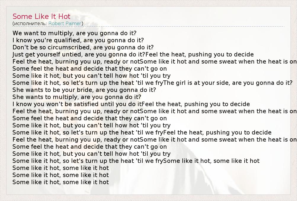 We want to multiply, are you gonna do it? I know you're qualified, are you gonna do it? Don't be so circumscribed, are you gonna do it? Just get yourself untied, are you gonna do it?Feel the heat, pushing you to decide Feel the heat, burning you up, ready or notSome like it hot and some sweat when the heat is on Some feel the heat and decide that they can't go on Some like it hot, but you can't tell how hot 'til you try Some like it hot, so let's turn up the heat 'til we fryThe girl is at your side, are you gonna do it? She wants to be your bride, are you gonna do it? She wants to multiply, are you gonna do it? I know you won't be satisfied until you do itFeel the heat, pushing you to decide Feel the heat, burning you up, ready or notSome like it hot and some sweat when the heat is on Some feel the heat and decide that they can't go on Some like it hot, but you can't tell how hot 'til you try Some like it hot, so let's turn up the heat 'til we fryFeel the heat, pushing you to decide Feel the heat, burning you up, ready or notSome like it hot and some sweat when the heat is on Some feel the heat and decide that they can't go on Some like it hot, but you can't tell how hot 'til you try Some like it hot, so let's turn up the heat 'til we frySome like it hot, some like it hot Some like it hot, some like it hot Some like it hot, some like it hot Some like it hot, some like it hot
