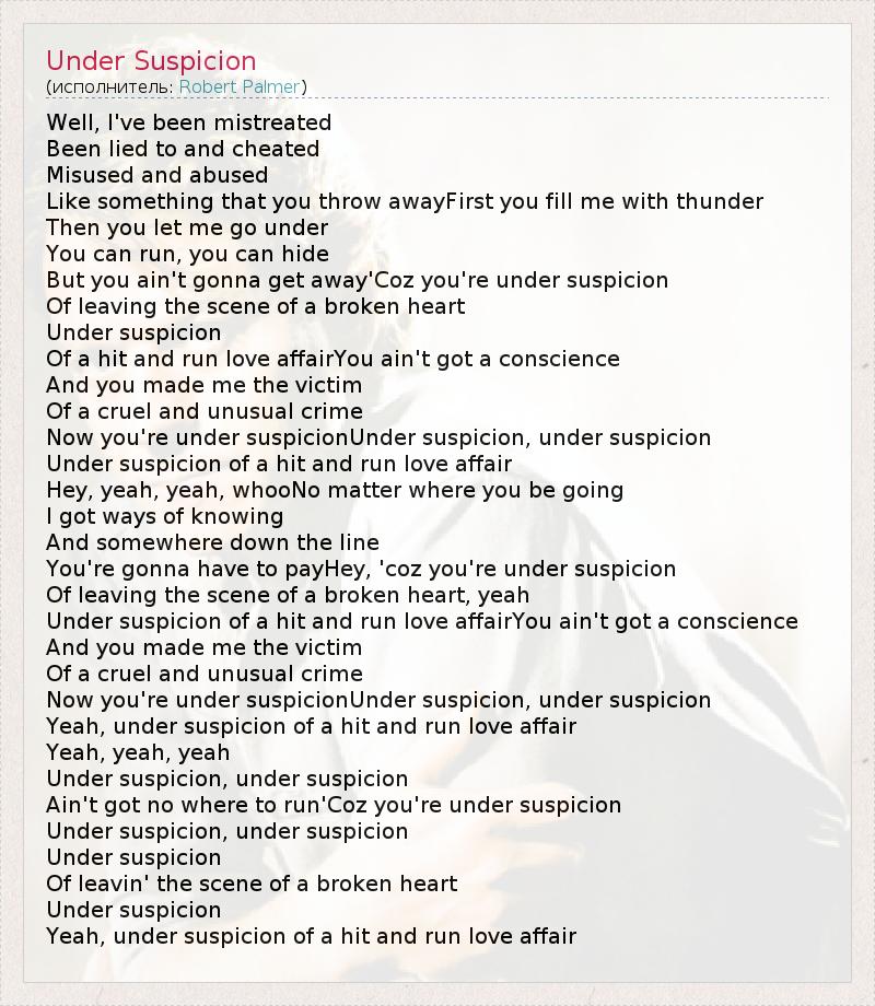 Well, I've been mistreated Been lied to and cheated Misused and abused Like something that you throw awayFirst you fill me with thunder Then you let me go under You can run, you can hide But you ain't gonna get away'Coz you're under suspicion Of leaving the scene of a broken heart Under suspicion Of a hit and run love affairYou ain't got a conscience And you made me the victim Of a cruel and unusual crime Now you're under suspicionUnder suspicion, under suspicion Under suspicion of a hit and run love affair Hey, yeah, yeah, whooNo matter where you be going I got ways of knowing And somewhere down the line You're gonna have to payHey, 'coz you're under suspicion Of leaving the scene of a broken heart, yeah Under suspicion of a hit and run love affairYou ain't got a conscience And you made me the victim Of a cruel and unusual crime Now you're under suspicionUnder suspicion, under suspicion Yeah, under suspicion of a hit and run love affair Yeah, yeah, yeah Under suspicion, under suspicion Ain't got no where to run'Coz you're under suspicion Under suspicion, under suspicion Under suspicion Of leavin' the scene of a broken heart Under suspicion Yeah, under suspicion of a hit and run love affair