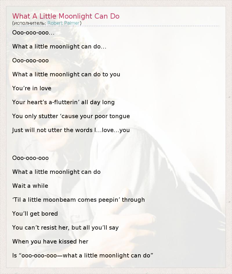 Ooo-ooo-ooo… What a little moonlight can do… Ooo-ooo-ooo What a little moonlight can do to you You’re in love Your heart’s a-flutterin’ all day long You only stutter ‘cause your poor tongue Just will not utter the words I…love…you Ooo-ooo-ooo What a little moonlight can do Wait a while ‘Til a little moonbeam comes peepin’ through You’ll get bored You can’t resist her, but all you’ll say When you have kissed her Is “ooo-ooo-ooo—what a little moonlight can do”