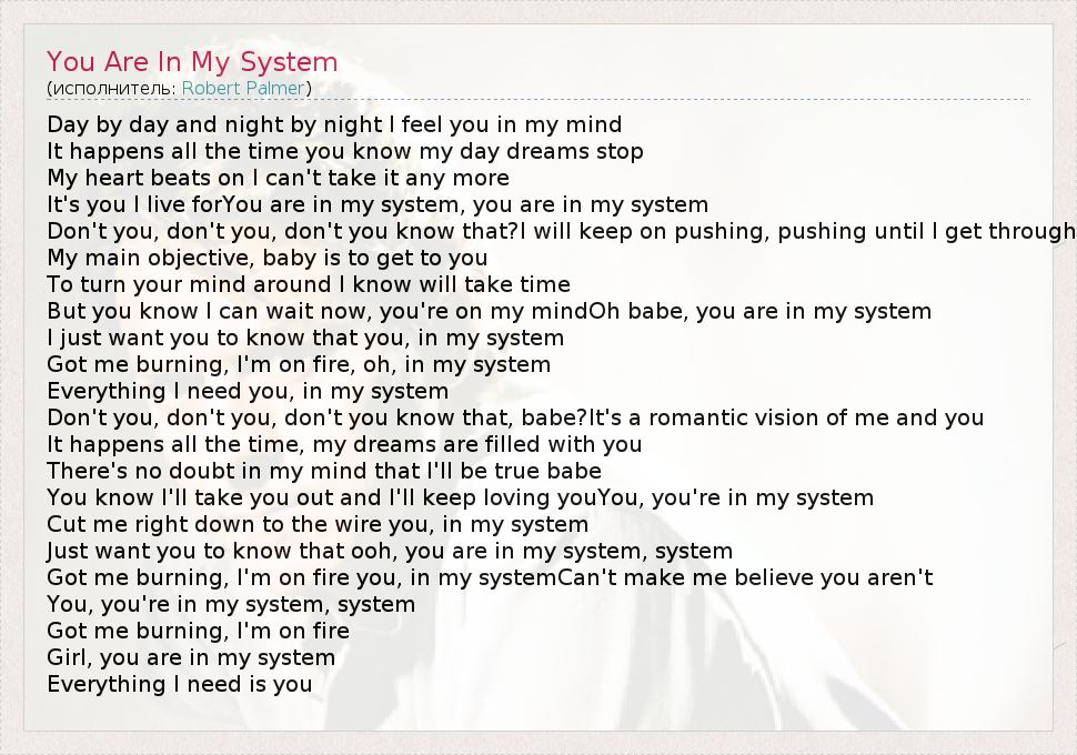 Day by day and night by night I feel you in my mind It happens all the time you know my day dreams stop My heart beats on I can't take it any more It's you I live forYou are in my system, you are in my system Don't you, don't you, don't you know that?I will keep on pushing, pushing until I get through My main objective, baby is to get to you To turn your mind around I know will take time But you know I can wait now, you're on my mindOh babe, you are in my system I just want you to know that you, in my system Got me burning, I'm on fire, oh, in my system Everything I need you, in my system Don't you, don't you, don't you know that, babe?It's a romantic vision of me and you It happens all the time, my dreams are filled with you There's no doubt in my mind that I'll be true babe You know I'll take you out and I'll keep loving youYou, you're in my system Cut me right down to the wire you, in my system Just want you to know that ooh, you are in my system, system Got me burning, I'm on fire you, in my systemCan't make me believe you aren't You, you're in my system, system Got me burning, I'm on fire Girl, you are in my system Everything I need is you