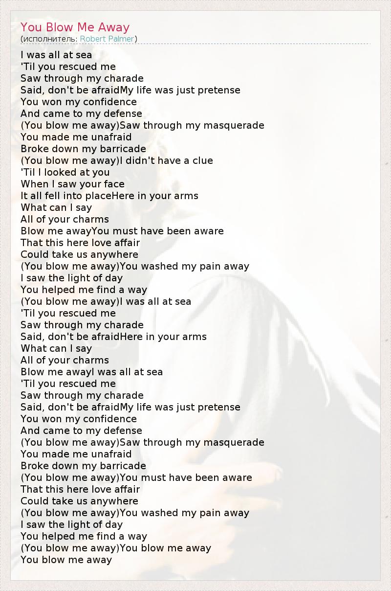 I was all at sea 'Til you rescued me Saw through my charade Said, don't be afraidMy life was just pretense You won my confidence And came to my defense (You blow me away)Saw through my masquerade You made me unafraid Broke down my barricade (You blow me away)I didn't have a clue 'Til I looked at you When I saw your face It all fell into placeHere in your arms What can I say All of your charms Blow me awayYou must have been aware That this here love affair Could take us anywhere (You blow me away)You washed my pain away I saw the light of day You helped me find a way (You blow me away)I was all at sea 'Til you rescued me Saw through my charade Said, don't be afraidHere in your arms What can I say All of your charms Blow me awayI was all at sea 'Til you rescued me Saw through my charade Said, don't be afraidMy life was just pretense You won my confidence And came to my defense (You blow me away)Saw through my masquerade You made me unafraid Broke down my barricade (You blow me away)You must have been aware That this here love affair Could take us anywhere (You blow me away)You washed my pain away I saw the light of day You helped me find a way (You blow me away)You blow me away You blow me away