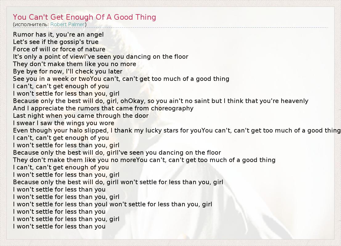 Rumor has it, you're an angel Let's see if the gossip's true Force of will or force of nature It's only a point of viewI've seen you dancing on the floor They don't make them like you no more Bye bye for now, I'll check you later See you in a week or twoYou can't, can't get too much of a good thing I can't, can't get enough of you I won't settle for less than you, girl Because only the best will do, girl, ohOkay, so you ain't no saint but I think that you're heavenly And I appreciate the rumors that came from choreography Last night when you came through the door I swear I saw the wings you wore Even though your halo slipped, I thank my lucky stars for youYou can't, can't get too much of a good thing I can't, can't get enough of you I won't settle for less than you, girl Because only the best will do, girlI've seen you dancing on the floor They don't make them like you no moreYou can't, can't get too much of a good thing I can't, can't get enough of you I won't settle for less than you, girl Because only the best will do, girlI won't settle for less than you, girl I won't settle for less than you I won't settle for less than you, girl I won't settle for less than youI won't settle for less than you, girl I won't settle for less than you I won't settle for less than you, girl I won't settle for less than you
